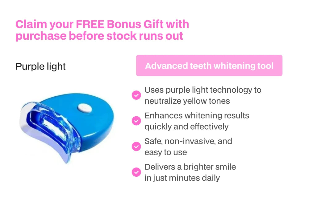 La tecnología correctora de color púrpura neutraliza los tonos amarillos al instante para lograr una sonrisa más brillante y de aspecto más limpio.